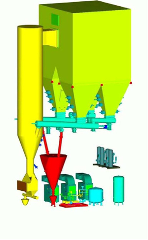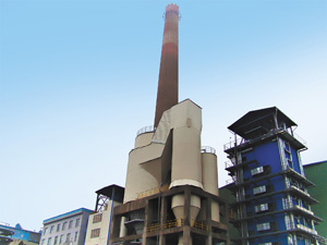 來自鍋(窯)爐的煙氣經靜電除塵器初步除塵后由凈化塔下部通過布風裝置進入凈化塔。霧化水由凈化塔喉部的高壓回流噴槍噴入凈化塔,以很高的傳質速率在凈化塔中與煙氣混合,煙氣中小液滴與氧化鈣顆粒以很高的傳質速率與煙氣中的SO2等酸性物質混合反應,生成CaSO4和CaSO3等反應產物。這些干態產物小部分從凈化塔塔底排灰口排出,大部分經過布袋除塵器分離、收集。鍋爐煙氣經過凈化塔脫硫凈化后,進入布袋除塵器系統。
