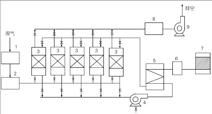 1 - 過(guò)濾阻火器;2 - 氣流分布器;3 - 吸附床;4 - 熱風(fēng)機(jī);5 - 換熱器 6 - 預(yù)熱室;7 - 催化燃燒床;8 - 集氣器;9 - 排風(fēng)機(jī)
